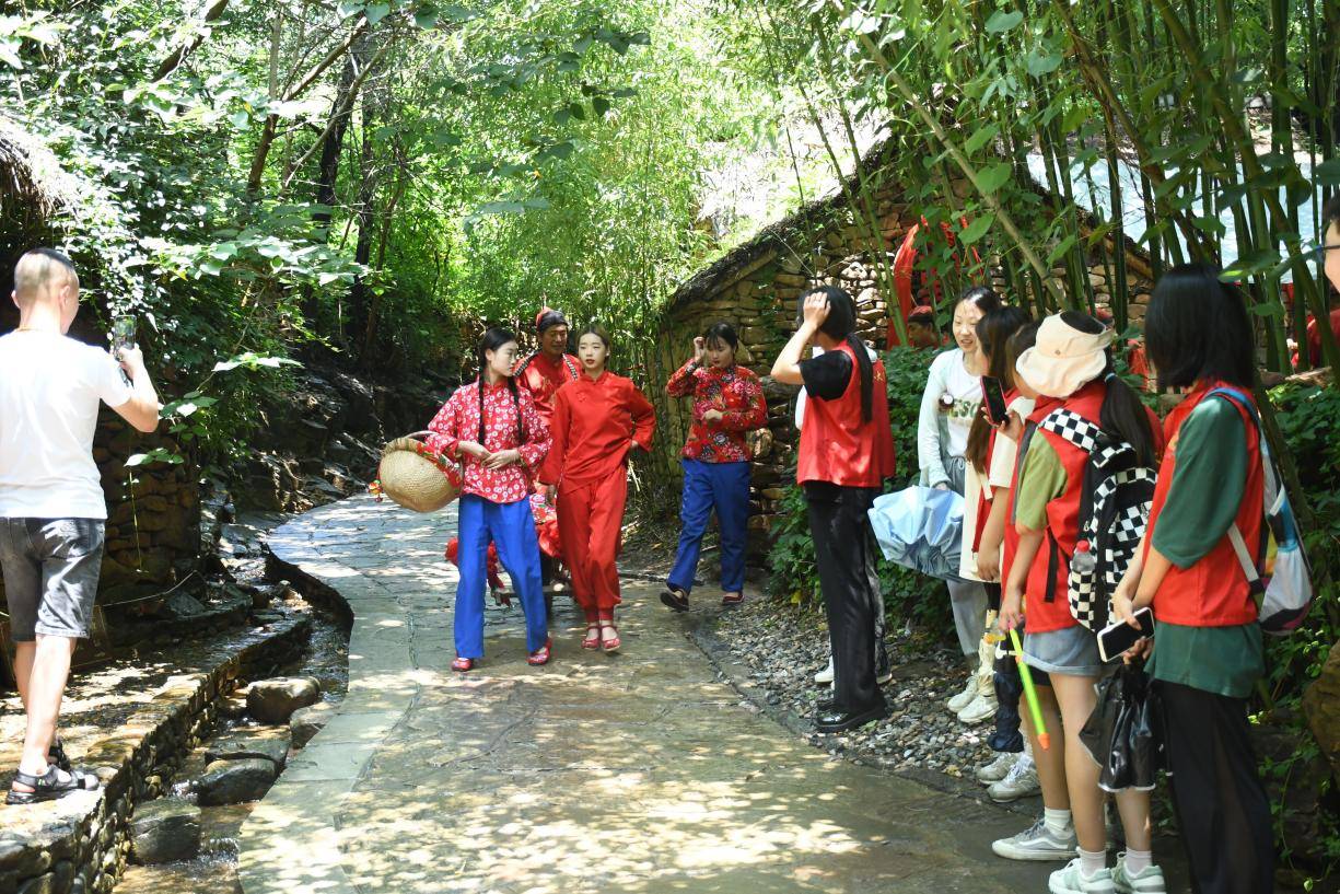 实践团进入竹泉村后明白了“竹泉村”名称的由来,竹泉村村落中部有一清泉,泉边多竹,因此得名竹泉村。而竹泉村的竹林、泉水、古村落的自然形态和各种民俗项目的展示保护是当下中国美丽乡村建设的典范,其中实践团体验的民俗项目之一是观看当地村民以前结婚的习俗。结婚流程分为三步:发嫁、迎娶、拜堂。与现在不同的是,如今出嫁坐轿车,过去出嫁坐推车;如今结婚有音响,过去结婚靠唢呐;如今结婚喜服多样,过去喜服只有一身红衣服。这项习俗的展示对年轻人来说多的是好奇和新鲜,而对于老一辈的人来说多的是感慨与熟悉。