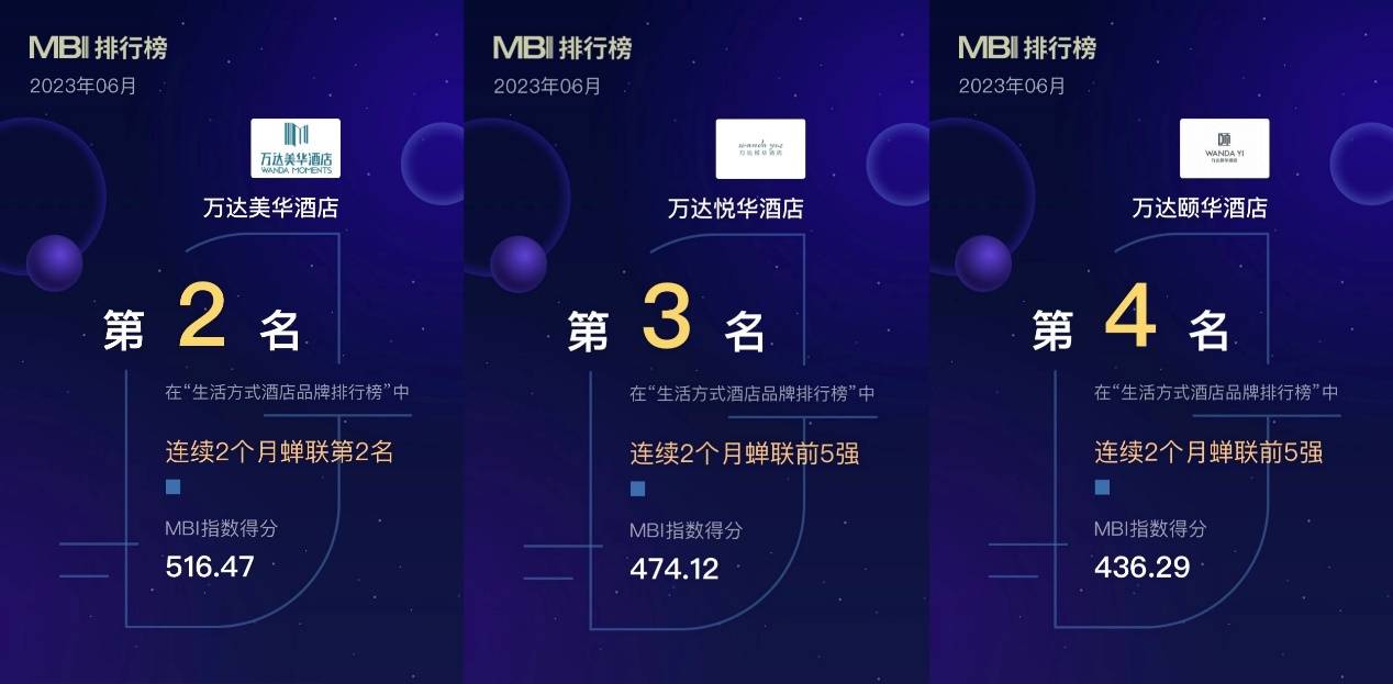 在近日发布的迈点MBI指数6月榜单里,万达生活方式酒店三大品牌——万达美华酒店、万达悦华酒店和万达颐华酒店,全线入围生活方式酒店前五强,分列第二名、第三名和第四名。同时,在三大类型榜单中,万达颐华酒店、万达美华酒店和万达悦华酒店均表现突出——分列国内高端酒店第二名、中高端酒店第三名和中端酒店第六名,相比5月均有提升。