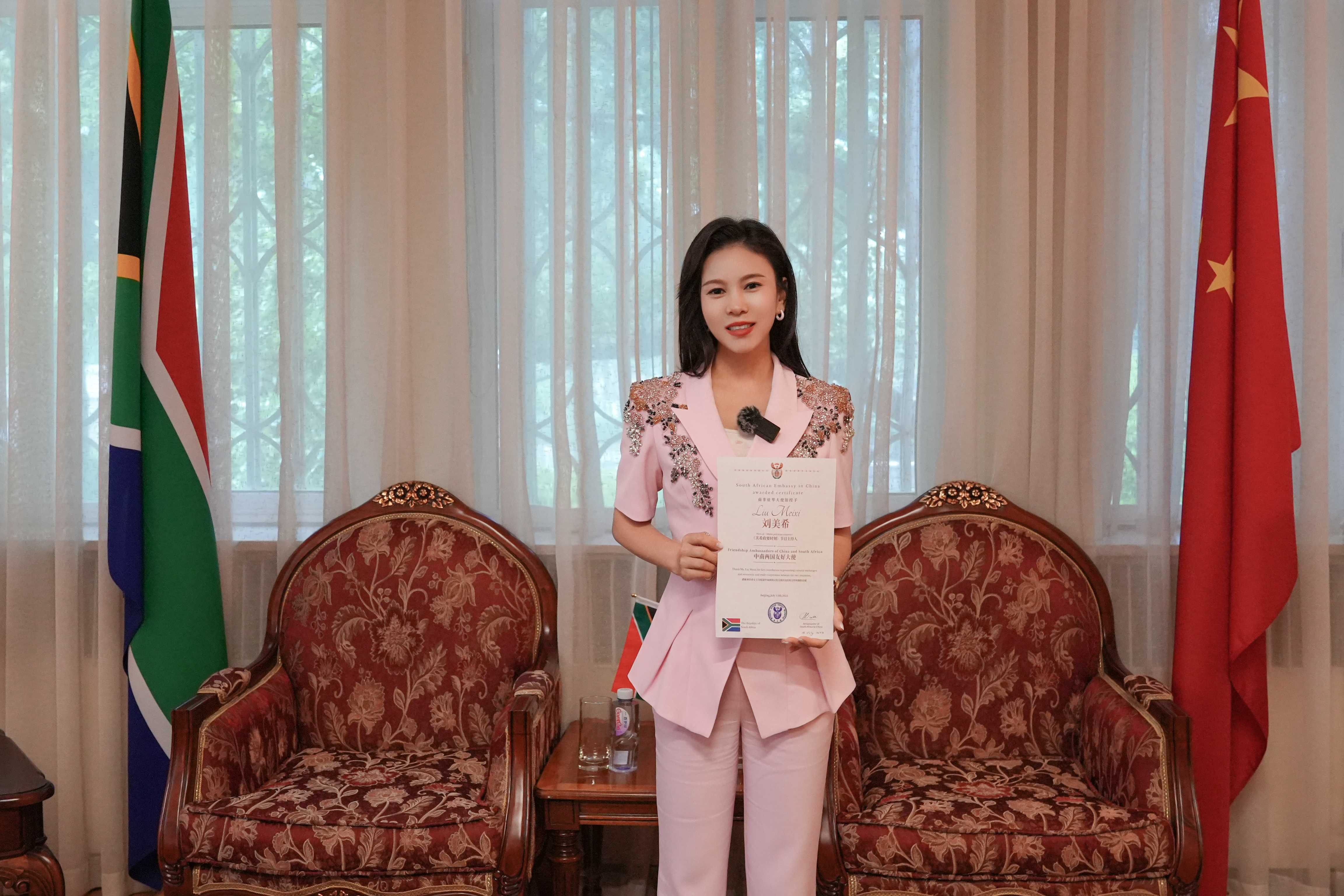 7月13日,凤凰全球观察团《美希政要时刻》节目主持人刘美希荣誉受封中南两国友好大使,由南非驻华大使谢胜文亲自为主持人刘美希授予证书,高度赞扬了她在中南两国文化交流上做出的贡献。此前,主持人刘美希还专访了南非驻华大使,深度探讨了两国在政治文化经济等领域的合作潜力,以及金砖国家扩展新成员的想法与意义。本次还举办了《外交新力量》的青少年活动,带青少年走进南非驻华大使馆,了解南非,认识南非,从青少年抓起对两国的友好交流,大使阁下对于凤凰全球观察团《美希政要时刻》节目以及《外交新力量》活动给予了高度肯定,也证明了主持人刘美希在国际上的影响力,以及对于中外文化交流的重要性。