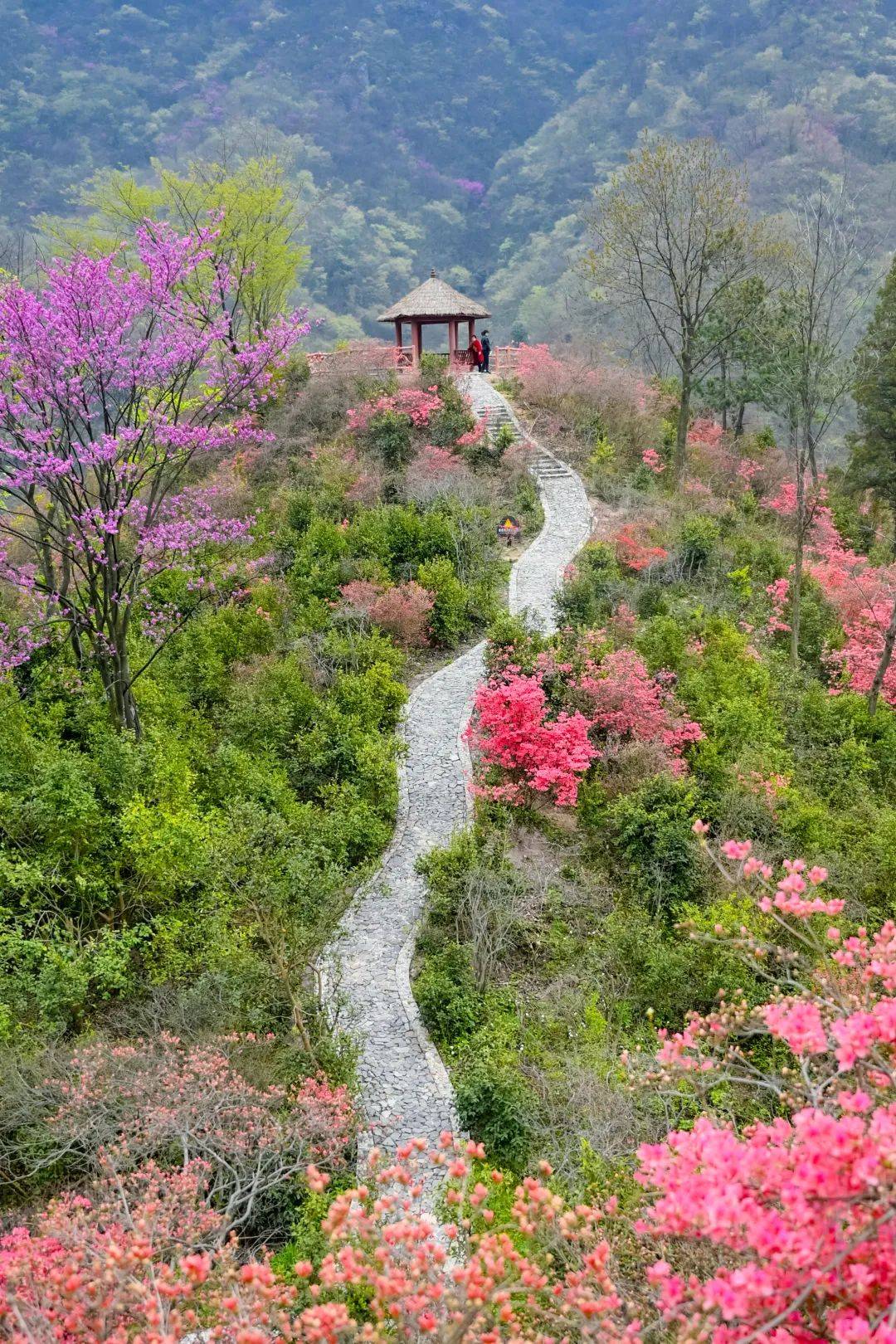当你来到杜鹃岭时,放眼远望,道道山梁层层叠叠,山梁之上,五颜六色的山岚让人目不暇接,争奇斗艳,好不热闹。热烈的红,清新的绿,红绿相间时不时花海里映入人的身影,又增加了一抹亮丽的色。