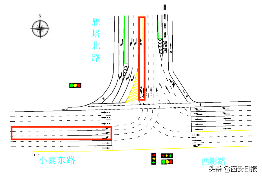 为消除小寨东路与西影路的掉头绕行交通流,本次改造拟打开雁塔北路与小寨东路丁字中央隔离护栏,增设1条北向东左转车道、3条西向北左转车道,施划相应渠化标线,配置信号灯及其他设施,允许雁塔北路由北向东以及小寨东路由西向北车辆经该路口直接左转通行,提前分流,避免进入景区道路加剧交通拥堵。