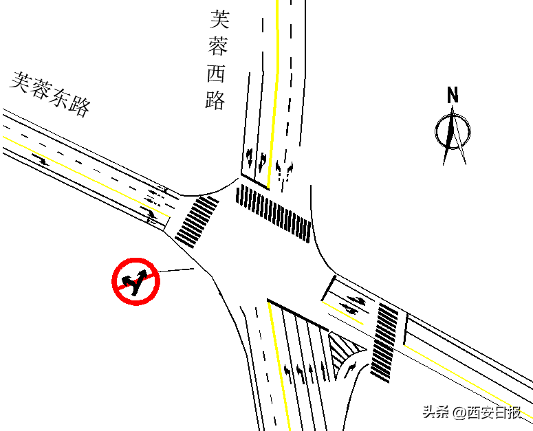 1、西影路与芙蓉东路交叉口西进口最右侧直行车道优化为直右车道,小寨东路由西向南过境车辆可提前从芙蓉东路驶入。