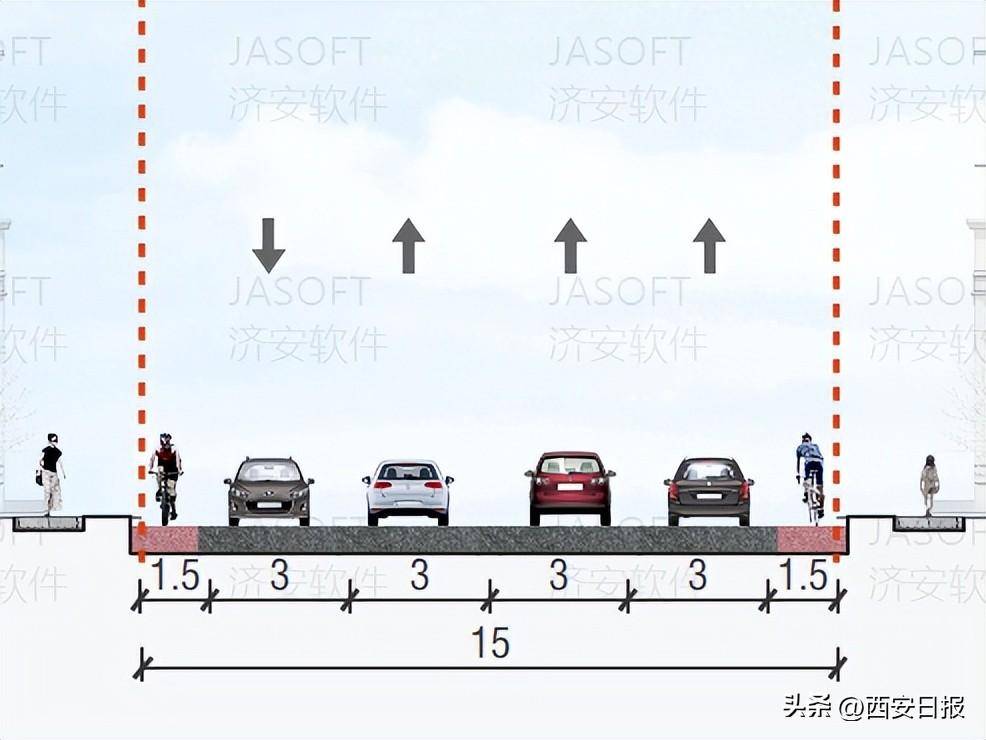 将芙蓉东路(西影路至芙蓉西路段)由单向行驶优化为双向行驶。根据交通流特性,设置北段为(西影路至大慈恩寺地上停车场出入口)由北向南1车道,由南向北3车道;南段为(芙蓉西路至大慈恩寺地上停车场出入口)由西北向东南1车道,由东南向西北为2车道,同时路侧增设双向非机动车道。