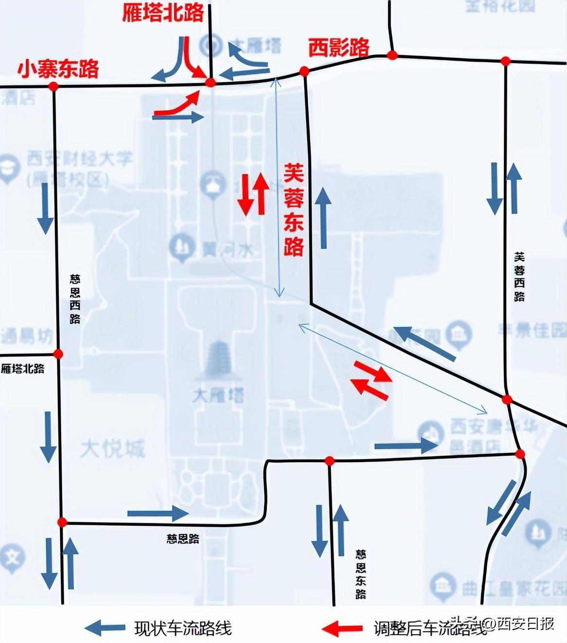 调整区域包括:芙蓉东路(西影路至芙蓉西路段)、小寨东路及雁塔北路丁字口。