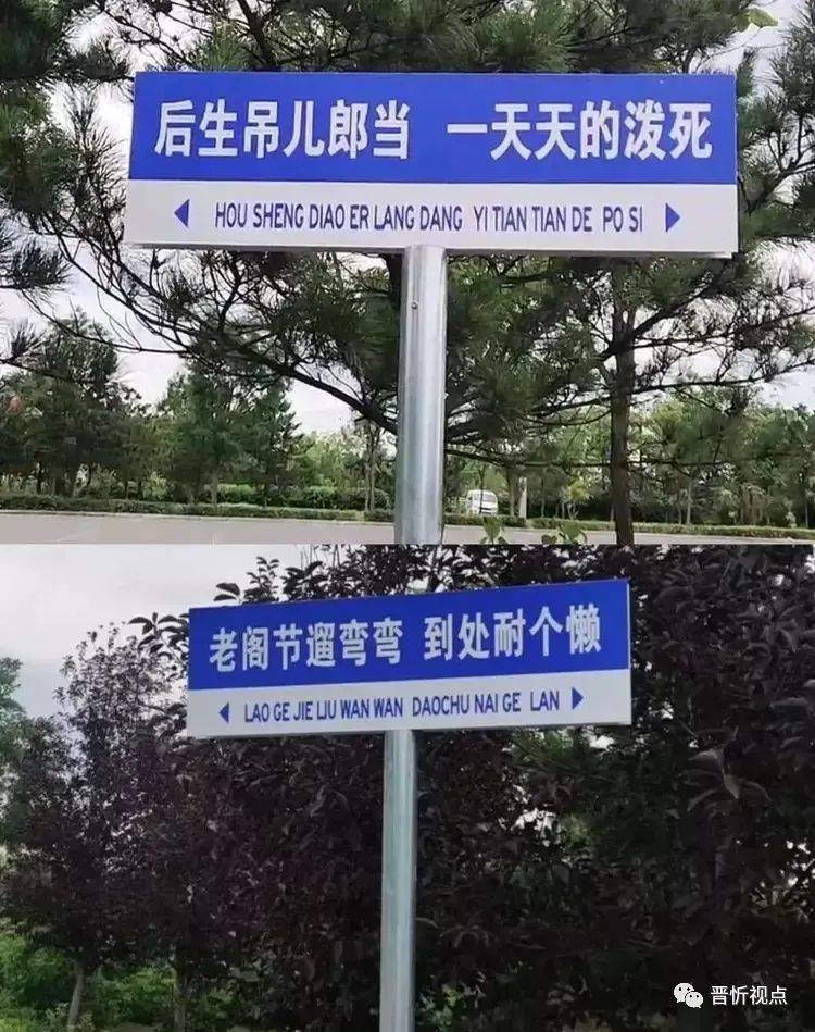 视频显示,在路边有一块路牌,上面写着方言“老阁节遛弯弯到处耐个懒”。还有一块路牌上面写着方言“后生吊儿郎当一天天的泼死”。