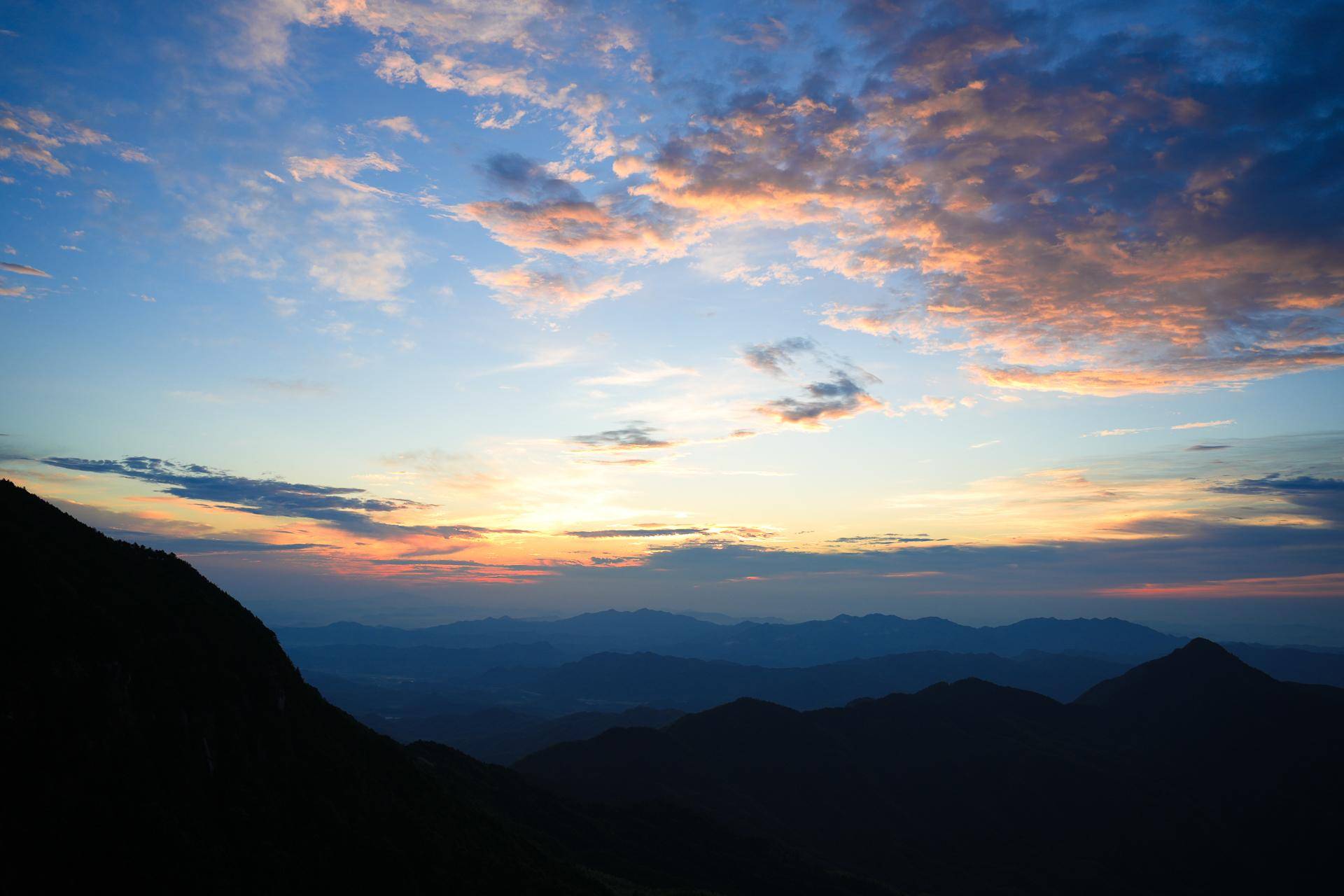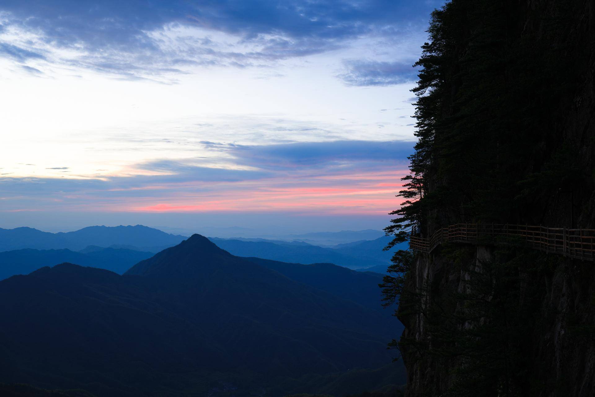 你见过凌晨五点的明月山日出吗?这次来明月山晚上就住在山顶的星空帐篷里,第二天凌晨4点就起床去看明月山的第一缕阳光。从明月山轻奢露营地出发走路到明月山的最佳观看日出的地方就在青云栈道。刚刚到那里的时候,走在青云栈道上仿佛走进了仙境一般。和你面对面的山脉就如同一位含羞的少女正在欢迎你的到来,刚开始只看到天空出现了一些红色的云层。