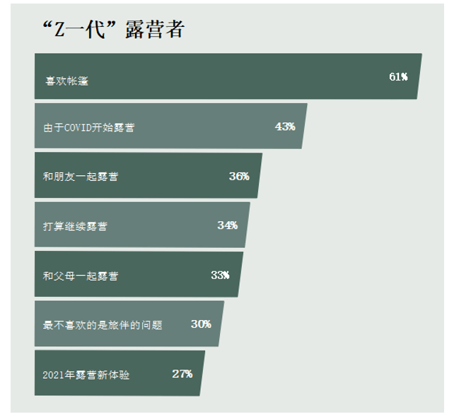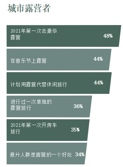 •将近一半的人(47%)会在2021年去露营,剩下的人(51%)计划在2022年去,其中57%的人也表示想尝试去健身;