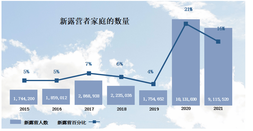 总体来说,近5700万户家庭在过去一年中至少进行过一次露营,相比之下,在疫情爆发之前的2020年仅有约4820万户,2019年仅有约4200万户家庭参与。