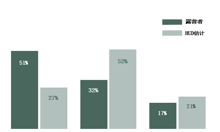 根据住房与城市发展部(HUD)和美国人口调查局(U.S.Census)共同进行的一项研究显示,在2017年美国住房调查(AHS)中,一半的美国家庭(52%)将他们居住的地区描述为郊区,而大约四分之一(27%)的家庭将他们居住的地区描述为城市,21%的家庭将他们居住的地区描述为农村。相比之下,在接受调查的所有露营家庭中,有一半(51%)认为他们居住在城市,32%认为居住在郊区,17%认为居住在农村。