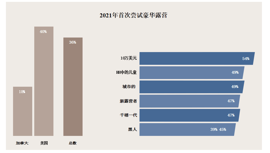 豪华露营和越野旅行正在成为旅行趋势。2021年,36%的露营者首次尝试豪华露营旅行,27%的露营者首次尝试越野旅行(通常定义为乘坐越野车旅行,没有服务,没有设施,自给自足)。预计这种旅行兴趣还会增长,50%的人想要寻求露营体验,46%的人希望在2022年尝试越野旅行。