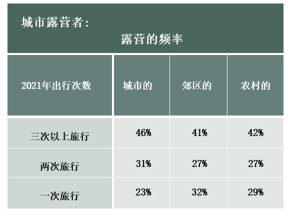 2021年,城市居民成为最热衷露营的群体之一。这类露营者最有可能在旅行和夜间频繁地露营。该群体也最有可能在2021年增加露营次数,并打算在2022年更频繁地露营。