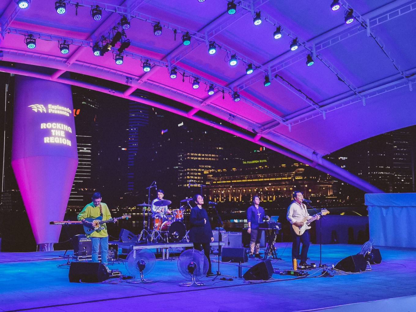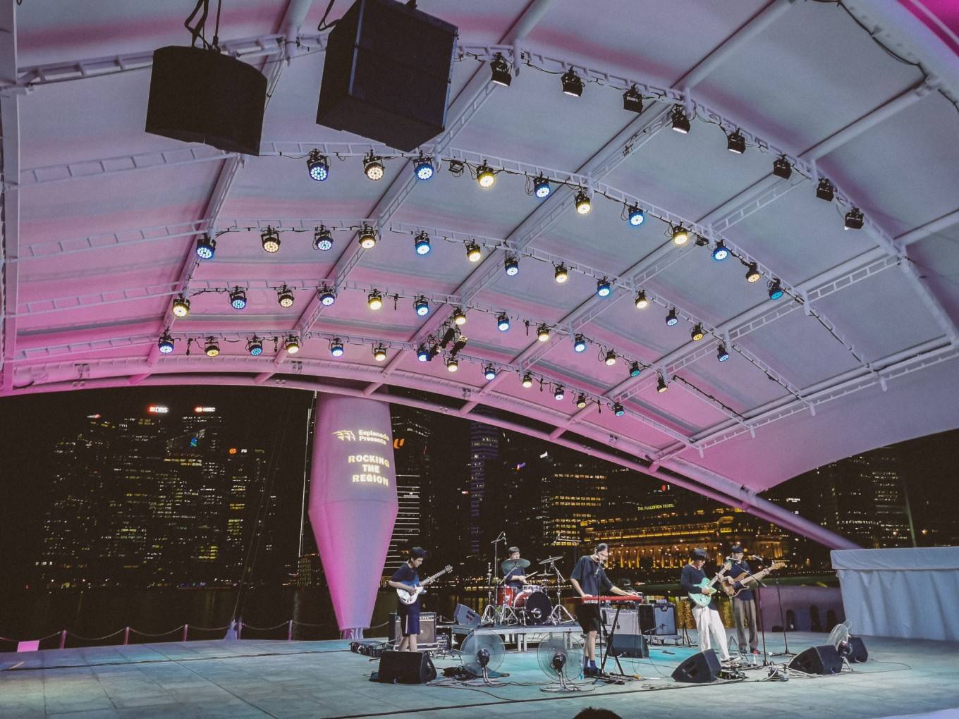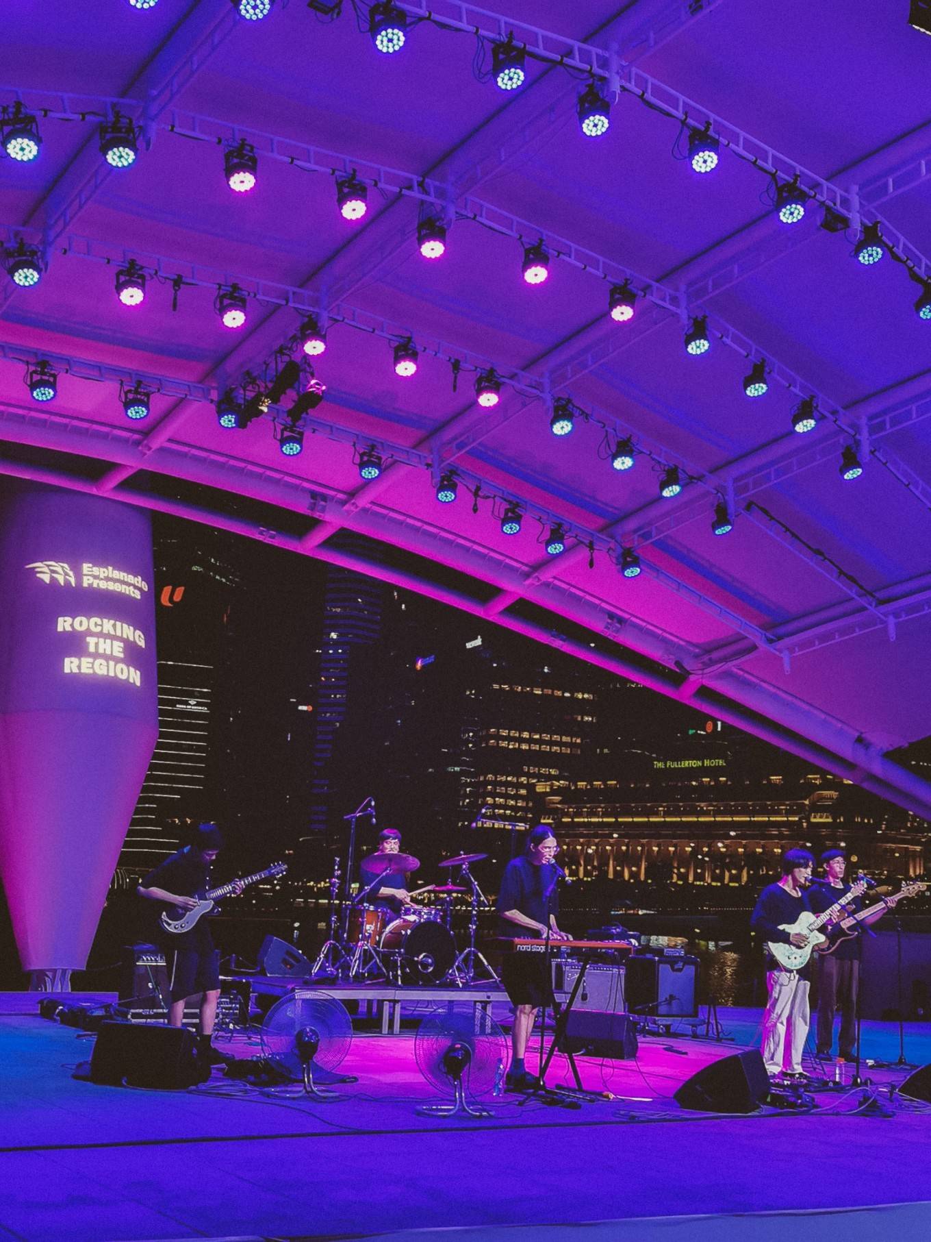 当天晚上有两个乐队的演出,Kurosuke(印尼)是7点和9点,FOLK9( 泰国 )是8点和10点,每场有半个小时,休息半小时再接着下一场。赶到滨海艺术中心露天舞台的时候FOLK9的8点场已经开始了,有工作人员会引导你找空位坐,随时有人离场,也随时有人进场,基本都能找到位置。