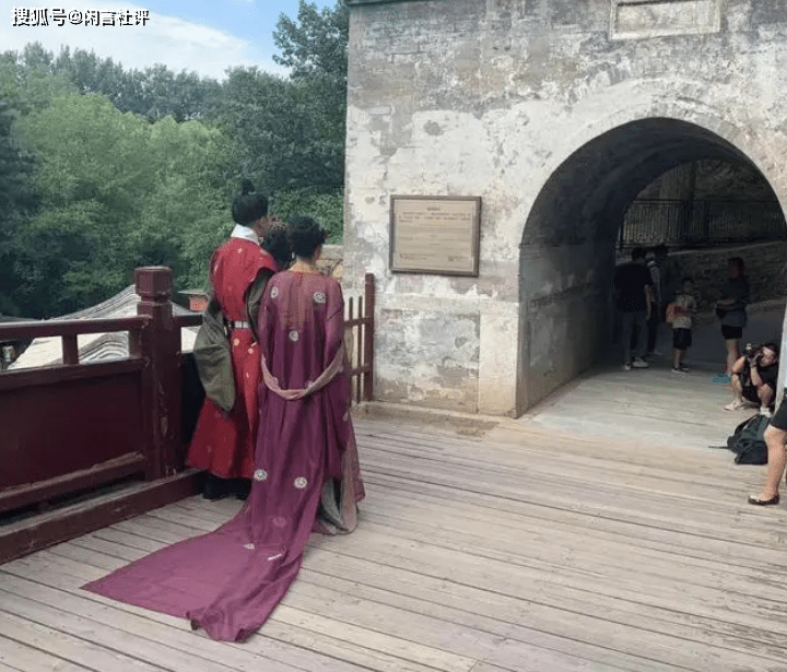 据报道,一位记者到访颐和园寅辉城关前时,发现几位身着古装的摄影对象在栏杆旁摆姿势,摄影师蹲在几米外的门洞内调整拍摄角度,并有助理拎着包。
