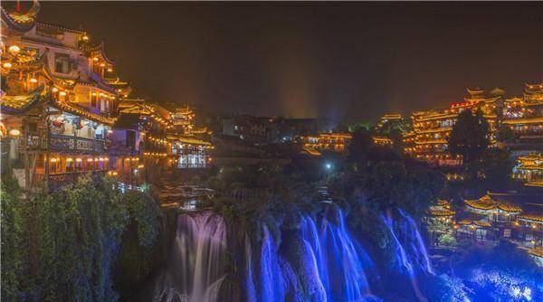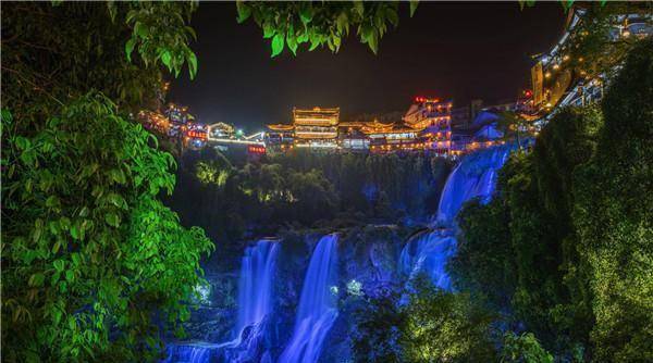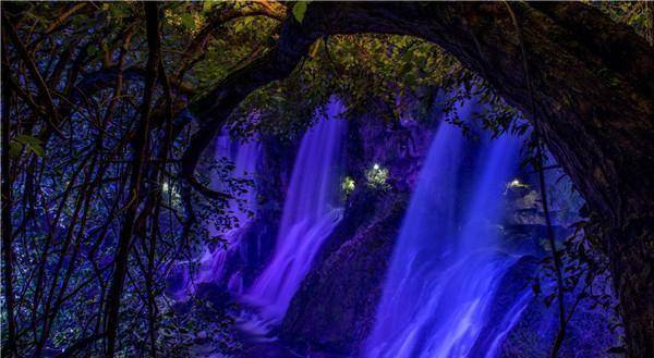 夜幕降临,站在不同的位置观瀑布,奇观叠出,在冷色灯光的照射下,蓝色瀑布似珠帘倾泻直下,喷珠溅玉,咆哮如雷,令人感受到惊天动地的力量。瀑布潇洒,飞流直下,丝毫不顾岩壁的阻挠,不惧撞击的破碎,坚强地倾泻着,融进深不见底的水潭,汇入巫水河流向远方。瀑布虽只有20多米高,却有“飞流直下三千尺,疑是银河落九天”的壮观气势。