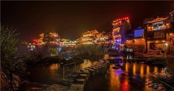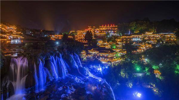 芙蓉镇的夜色是自然环境与人文景观的结合体,陡岩、河流、瀑布、深潭是大自然赐予芙蓉镇居民的厚礼,芙蓉镇的人们为了生存,竟在飞流瀑布之上或是陡峭的绝壁上建造吊脚楼,打造清一色的青瓦木架板墙的古建筑,大自然与人文景观结合得十分和谐,堪称完美。在夜光灯的映照下,栋栋排排、层层叠叠,近在眼前,却映若天际,水瀑如海,由近及远,望至天际,似夜幕下的海市蜃楼,美若仙境,此景只有芙蓉镇,别无胜处。