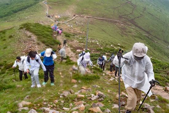 7月15日,北京,门头沟区清水镇江水河村灵山森林公园,徒步登山者们顶着风雨攀登。视觉中国供图