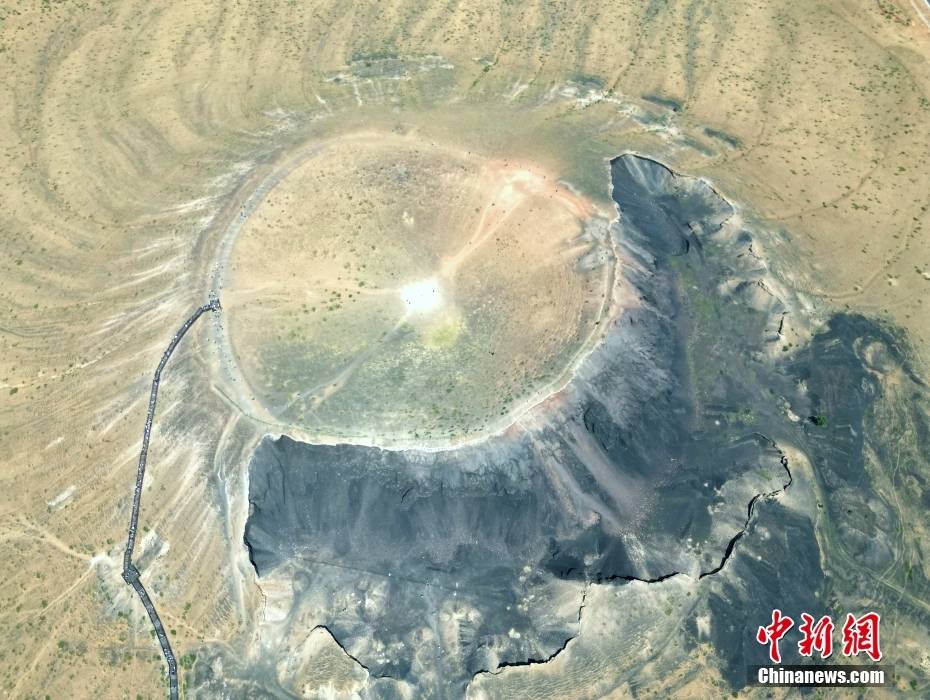 游客在乌兰哈达火山群3号火山游玩。(无人机照片)中新社记者 赵隽 摄