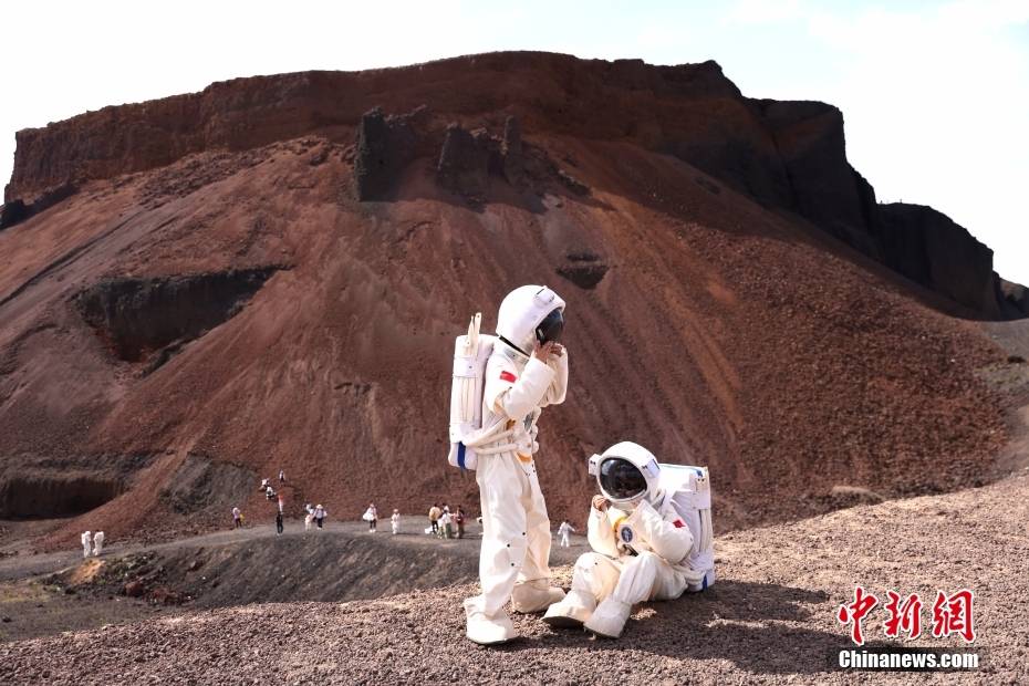 游客身穿“宇航服”在乌兰哈达火山群6号火山游玩。中新社记者 赵隽 摄