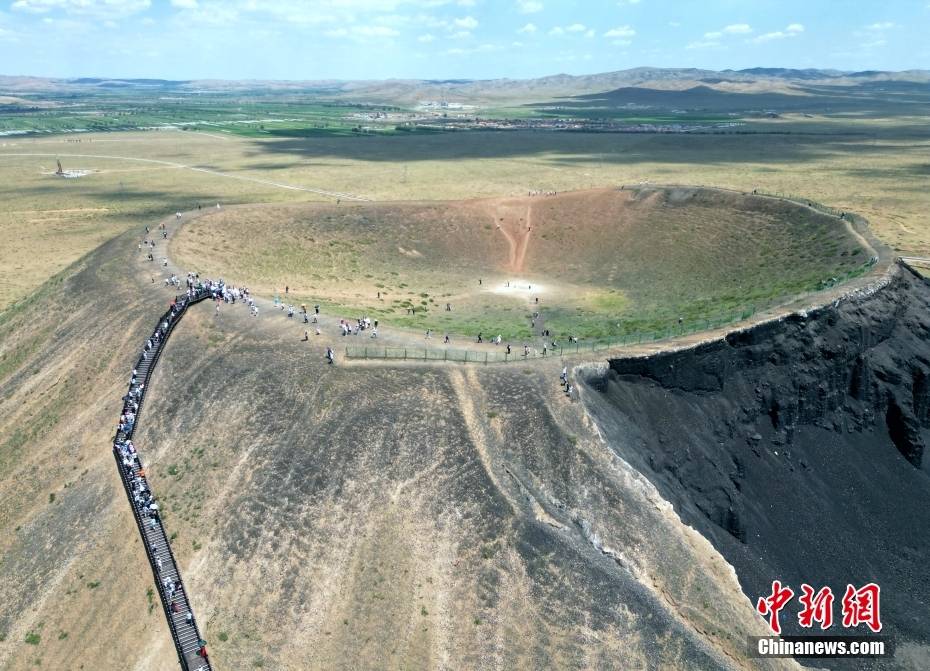 7月17日,游客在乌兰哈达火山群3号火山游玩。随着暑期旅游旺季的到来,乌兰哈达火山群游客络绎不绝。乌兰哈达火山群位于内蒙古乌兰察布市,由20多座火山组成的草原火山群景观有“火山博物馆”之称。(无人机照片)中新社记者 赵隽 摄