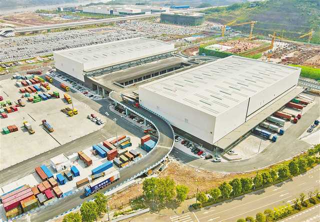 位于果园港国家物流枢纽的中新(重庆)多式联运示范基地,一期项目集拼仓库和集装箱堆场一片繁忙。(重庆日报资料图片)记者 张锦辉 摄/视觉重庆