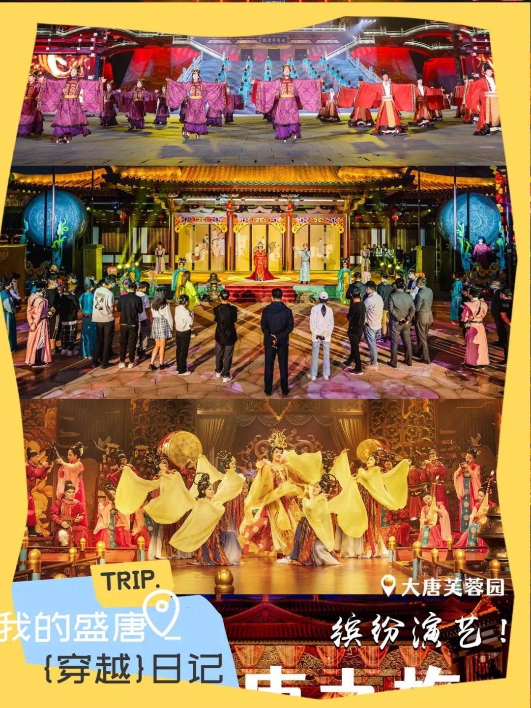 营业时间 09:00-23:00 交通指南 西门公交站:22路,23路,24路,44路,189路,224路,224路延点区间,307路,526路,609路,游9路,146路,212路 曲江旅游环线,地铁4号线A口 - 四大“梦系列”主题演出 《鼓》 演出时间:16:00/18:00 演出地点:紫云楼三楼 《梦回大唐》 演出时间:15:00/17:00 演出地点:凤鸣九天剧院 《寻梦·芙蓉里》 演出时间:19:30 演出地点:仕女馆 《大唐追梦》 演出时间:21:00 演出地点:长安码头