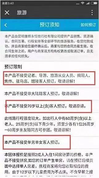 ▲2017年,携程网上部分云南游产品,对游客的职业及地域进行了限制。图片来源/网络