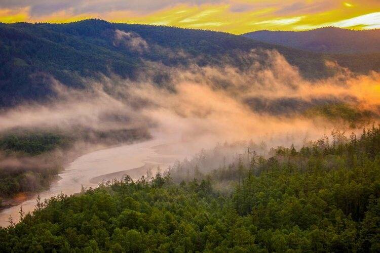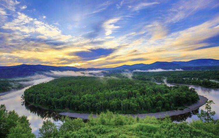 黄昏、蒸汽、河流、植被构成完美的油画图