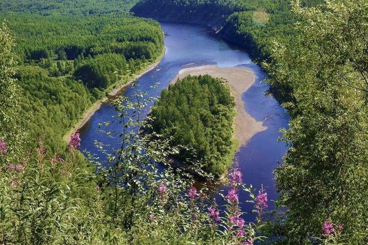 一望无际的森林植被、河水清澈的映出蓝天