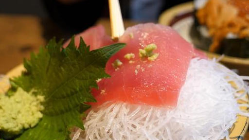 图中的这种是金枪鱼生鱼片。看看这金枪鱼生鱼片颜色多漂亮的!看起来是半透明的,颜色像极了冰淇淋的颜色,看起来也是非常让人有食欲的,夹了一筷子的金枪鱼生鱼片入嘴,咬了一口后才知道什么是顶级美味,这金枪鱼的鱼肉实在是太嫩了,吃起来的感觉是入口即化的,非常的好吃!看看,这美味的生鱼片,有没有馋到你呢?想不想来一块尝尝它的味道