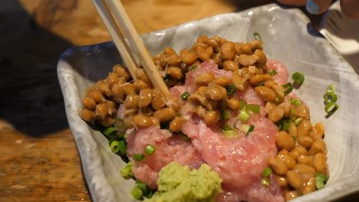图中的这个是金枪鱼的肉泥加上一些臭纳豆,吃的时候这样拌着吃的。