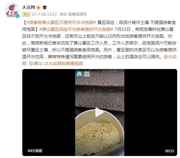 原标题:游客称黄山景区不提供开水冲泡面?景区回应:因汤汁破坏土壤,不提倡游客食用泡面
