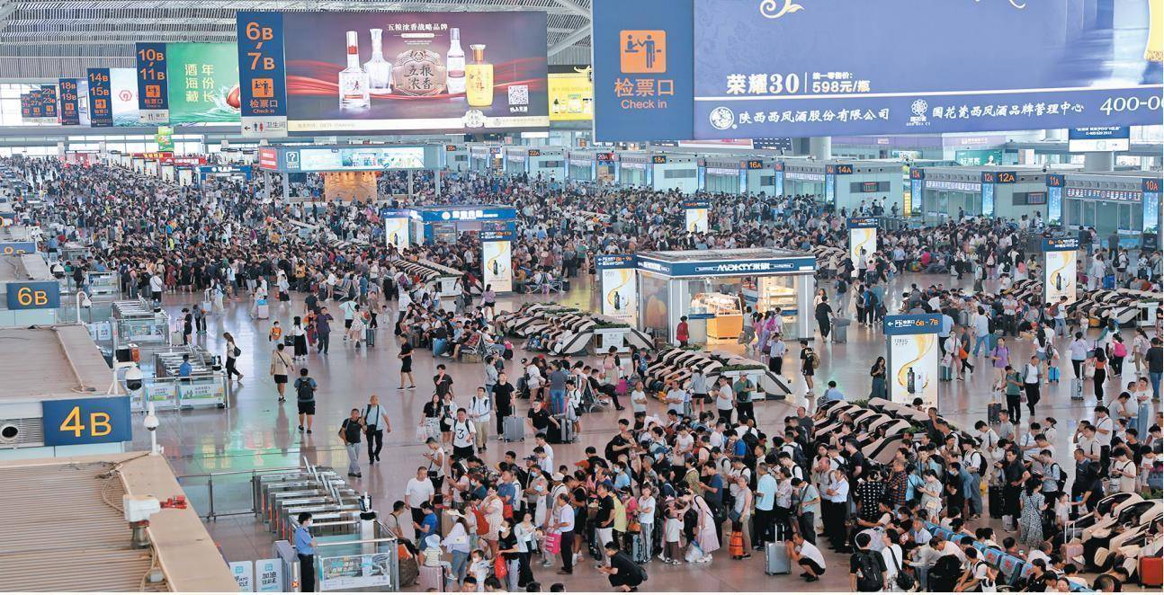 西安北客站候车大厅(7月17日摄)。当日,国铁西安局共发送旅客48.4万人次,较去年同期增长152.3%。其中,西安站发送旅客27.9万人次,较去年同期增长217.9%。暑运期间,国铁西安局开行西安至漠河、满洲里以及潼关至兰州等多个方向的避暑旅游专列,8月还将动态加开不同方向旅游专列,以满足旅客出行需求。 记者 张辰摄