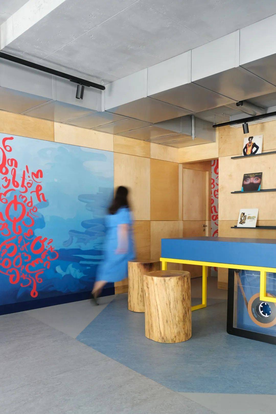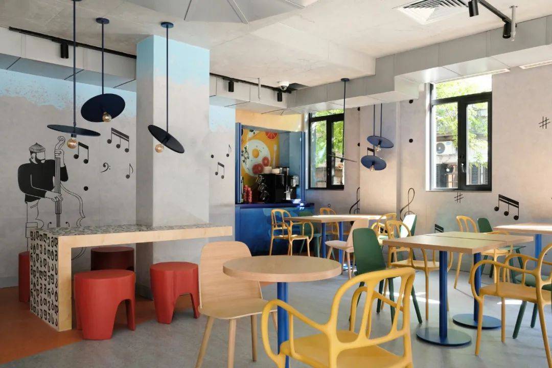 一个磁带造型的前台用于接待旅客,背景墙陈列摆放着一系列复古黑胶唱片。酒店以浅蓝色为背景,配以胶合板镶板以及红色和黄色的点缀,充满童趣,如带有Ksenia Stoylik印花图案的乒乓球桌、格鲁吉亚字母和音乐涂鸦的家具。