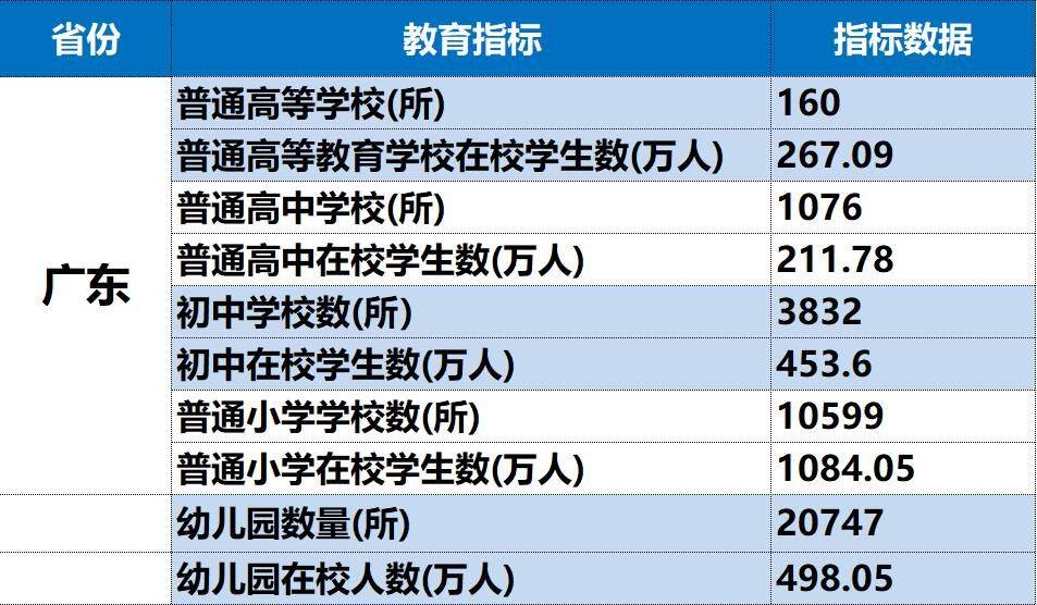 根据广郡通数据平台(guangjuntong.com)提供的数据,广东拥有160所普通高等学校,共计在校学生数达到267.09万人。同时,广东还拥有1076所普通高中学校,211.78万在校学生,以及3832所初中学校,453.6万初中在校学生。