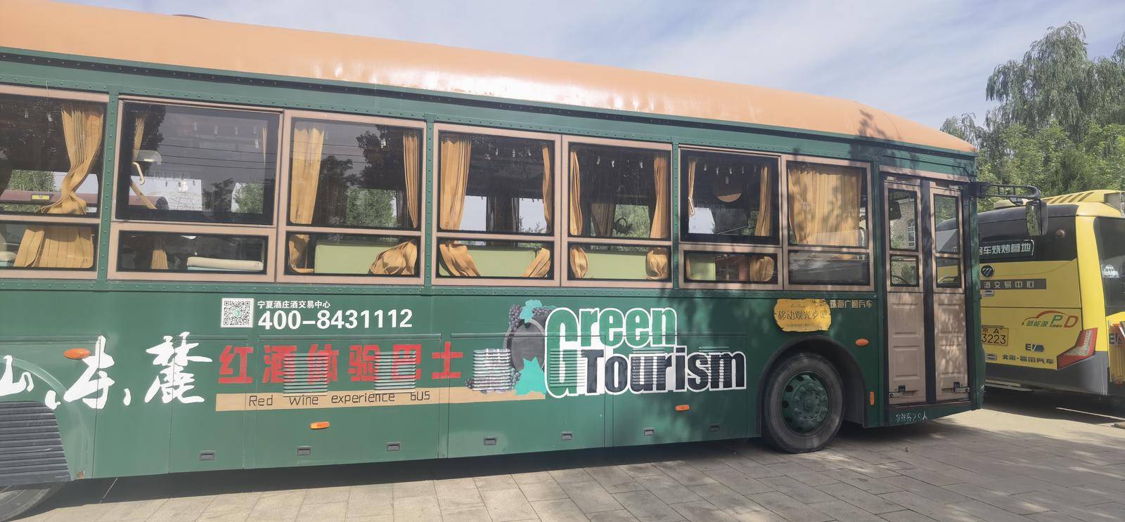 宁夏(银川)贺兰山东麓旅游度假区里,“有梦想的红酒巴士”正在待客。