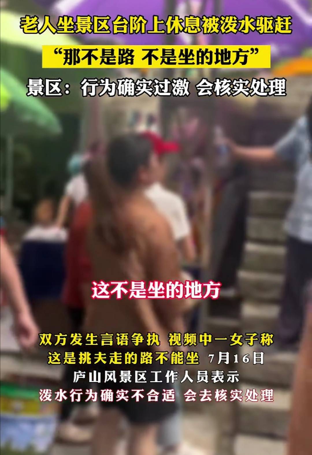 庐山三叠泉景区的商家,对坐在台阶上的游客, 泼水驱赶, 并声称这里不是路 ,不是你坐的地方。
