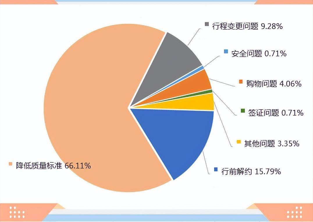 在投诉理由方面,降低质量标准1026件,占比66.11%;行前解约245件,占比15.79%;行程变更问题144件,占比9.28%;购物问题63件,占比4.06%;安全问题11件,占比0.71%;签证问题11件,占比0.71%;其他问题52件,占比3.35%。