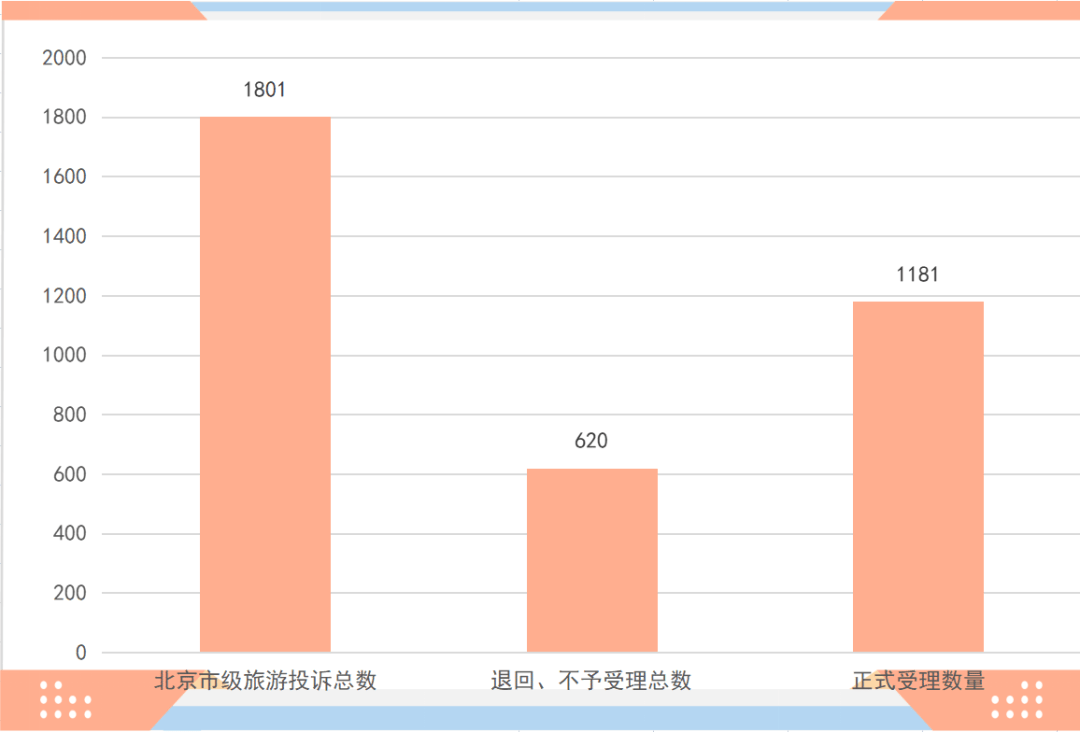 2023年第二季度,北京市文化和旅游局市场质量监督与咨询服务中心收到涉及旅行社的旅游投诉1801件,其中有620件因不属于旅游投诉处理机构职责范围或者管辖范围等原因不予受理或退回,正式受理涉及旅行社的旅游投诉1181件。