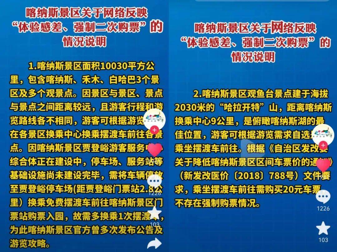 最早可以追溯到6月初,某平台博主蓝战非发布视频投诉新疆喀纳斯国家地质公园两大问题,一个是景区内频繁换乘区间摆渡车,二是观鱼景点强制二次收取门票。几天后,博主星陳旅行纪也同样发文称,其在喀纳斯景区遭遇了令人费解换乘区间车的经历。