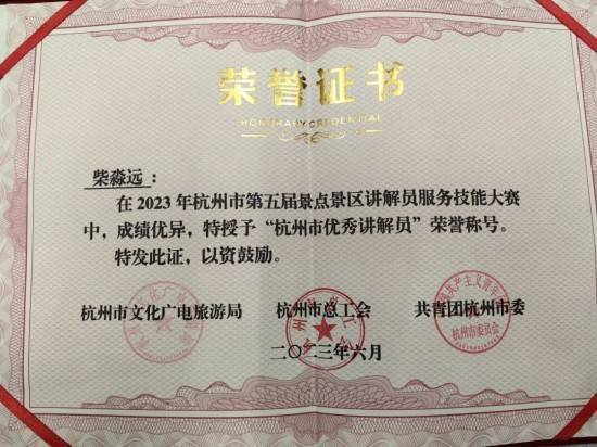 近日,杭州市文化广电旅游局、杭州市人力资源和社会保障局、杭州市总工会、共青团杭州市委联合主办对杭州市第五届景点景区讲解员服务技能大赛获奖选手颁奖。花港管理处接待服务中心副主任柴淼远获评“杭州市优秀讲解员”荣誉称号。