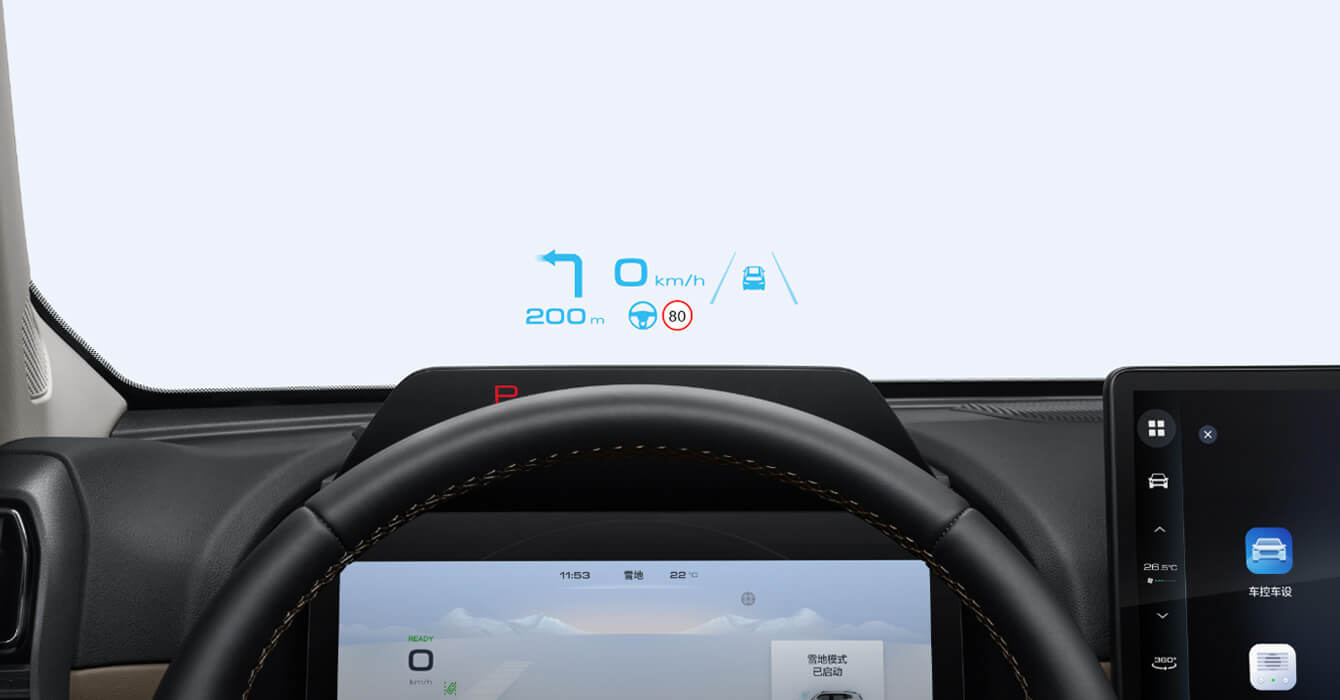 值得一提的是,哈弗二代大狗PHEV还搭载了W-HUD抬头显示功能,能将限速标志/当前时速/导航信息/ACC 跟车距离4项内容统统显示到驾驶员前方挡风玻璃处,并且雪地模式下,还贴心的配备蓝字显示。驾驶员再也不用反复转换视线确认随时变化的驾驶信息,开车更轻松,也更安全。