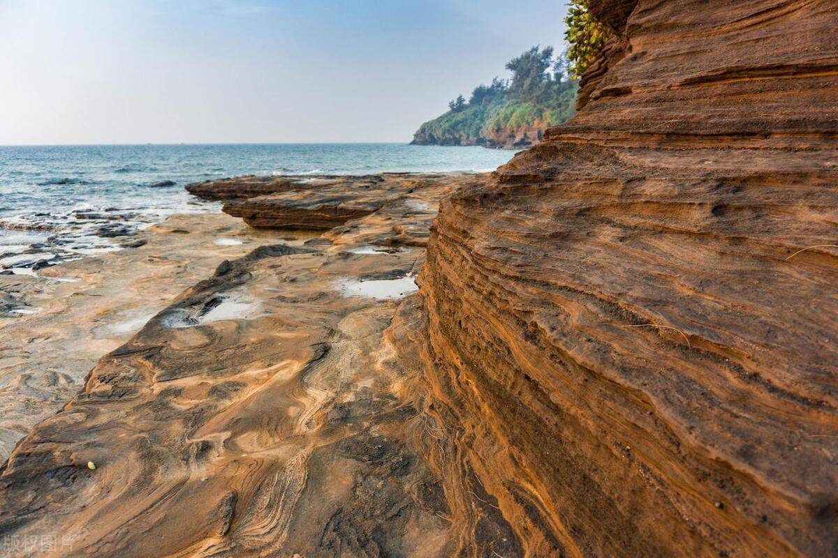五彩滩位于涠洲岛东海岸,长达1.5公里的海岸几乎都发育有20-50米高的海蚀崖,崖面耸立,蔚为壮观。退潮时可见宽达几十米至上百米的海蚀平台,海蚀平台上的青苔和海水在朝阳的照映下,五彩斑斓,海蚀洞随处可见。