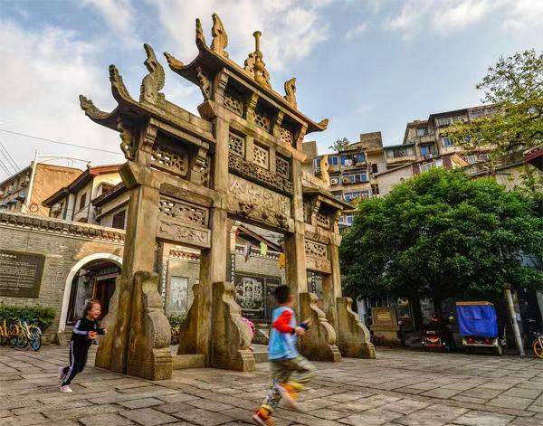 散发着古韵的西文庙坪牌坊下,孩子们自由地玩耍。长沙晚报全媒体记者 邹麟 摄