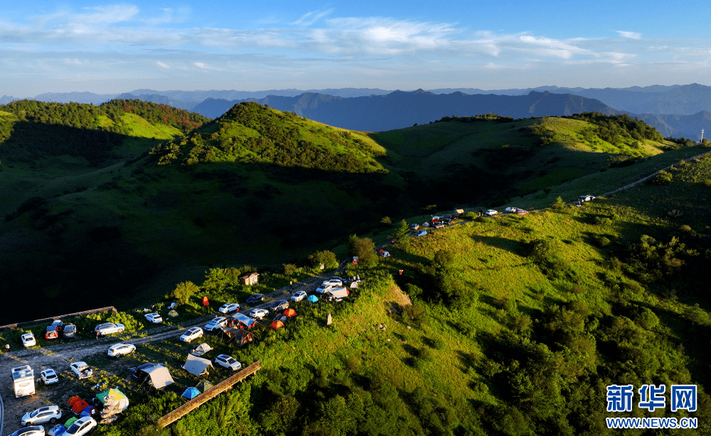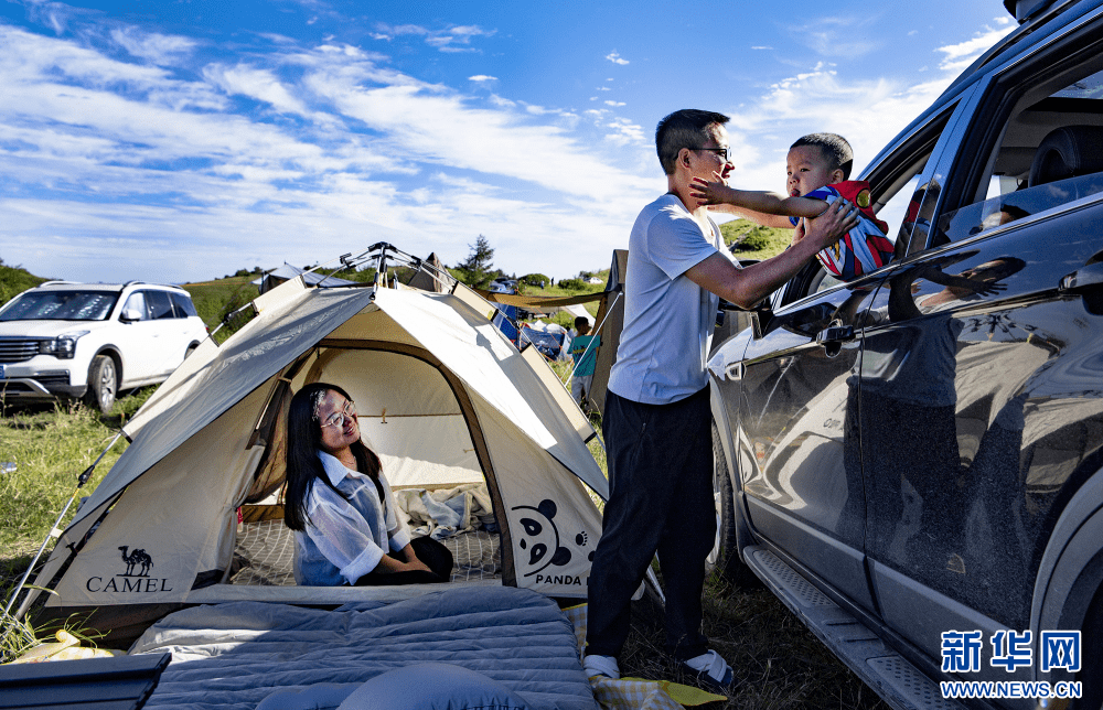 岚皋张斌一家在巴山大草原安营扎寨,欢度周末时光。新华网发(张岚 摄)