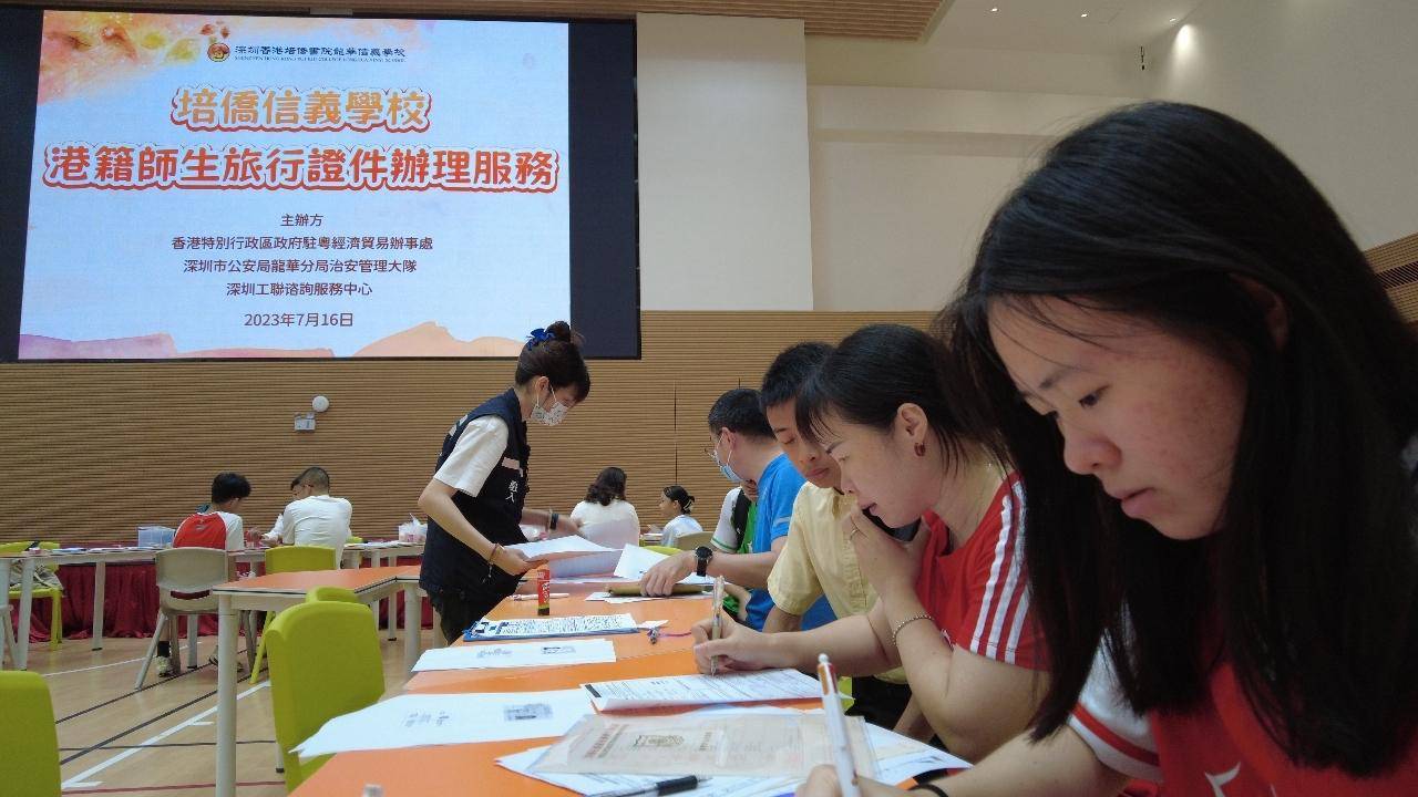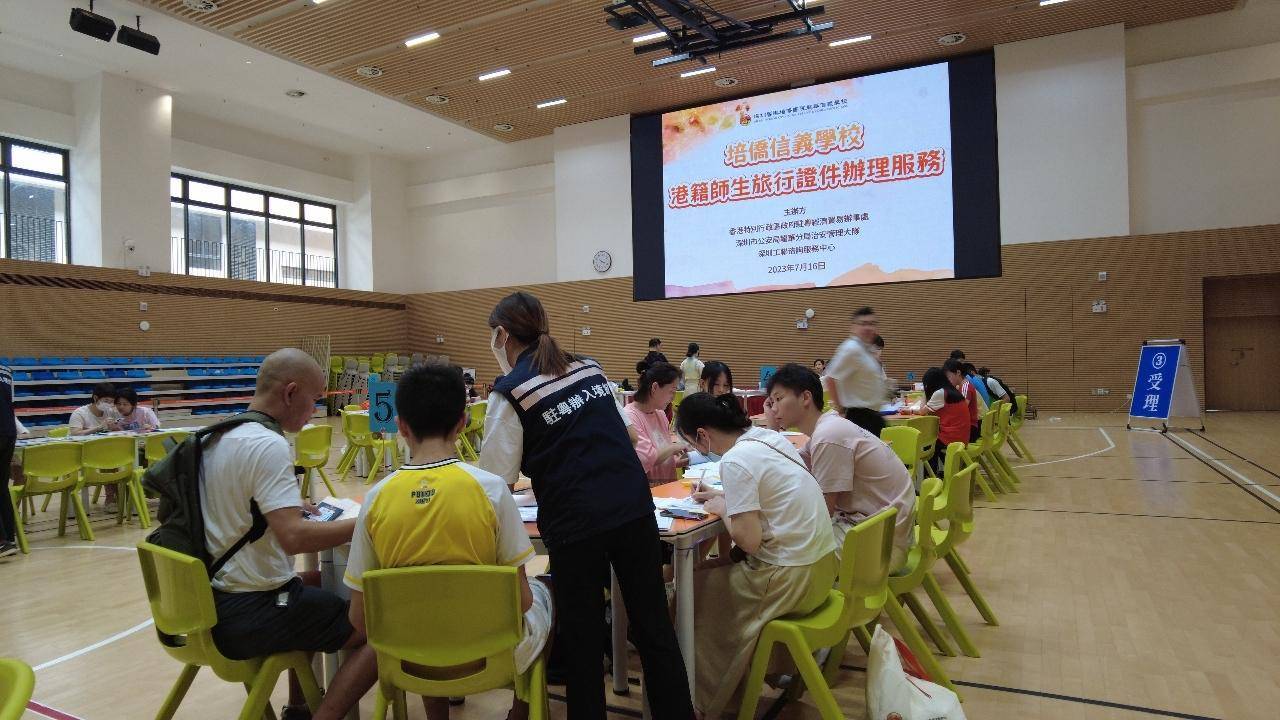 暑期来临,港籍师生外出旅游意愿高涨,办证需求旺盛。7月16日,香港驻粤办入境组14名工作人员来到深圳,为深圳香港培侨书院龙华信义学校港籍师生和家长现场办理旅游证件。本次证件办理活动共有400名师生及家长报名参加,其中,350名申领香港特区旅行证件,另有50名报名申请回乡证。