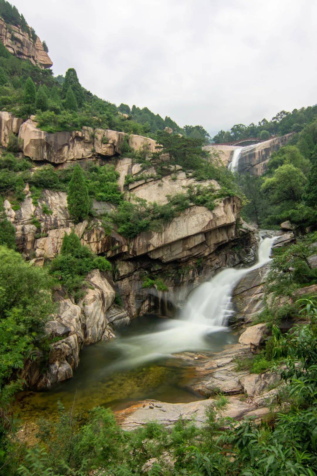在泰山东麓的天烛峰景区内,连续的降雨累积了丰沛雨水,溪水潺潺,水流顺着河道向下倾泻,形成了大大小小的瀑布景观。