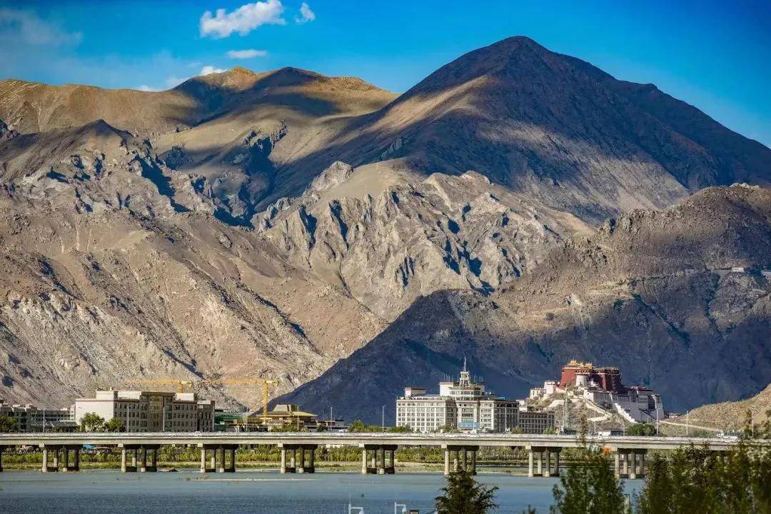 拉萨城区很小,海拔3650米,常住人口不到百万。整座城市东西呈长条形分布,拉萨河穿城而过。城市的布格局很像热狗,两山中间夹一个平原,再串上一条河。