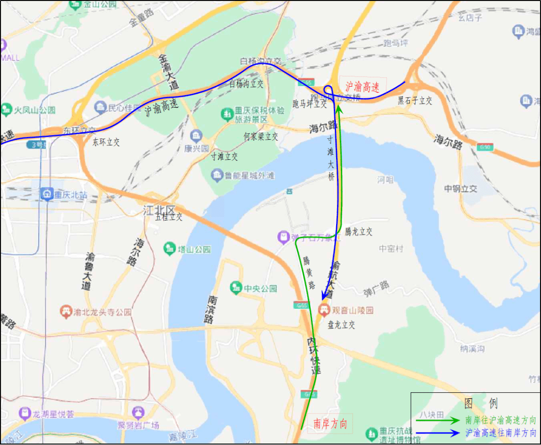 2.施工期间(2023年7月23日至9月10日)每日7:00-22:00,寸滩大桥在执行原货车限行管理规定的基础上,允许持红色通行证的货车临时借道通行。持红色通行证的货车借道通行线路:往江北方向可经腾黄路-腾龙立交-寸滩大桥-跑马坪立交-沪渝高速进入内环快速路;往南岸方向可经沪渝高速-跑马坪立交-寸滩大桥-盘龙立交进入内环快速路(图2)。