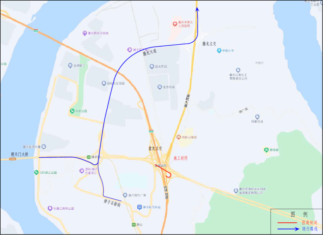 施工期间(2023年7月23日至9月10日),封闭盘龙立交由朝天门大桥经峡江路至渝航大道方向的匝道。该匝道封闭期间,车辆可绕行腾龙大道-腾龙立交进入渝航大道(图1)。