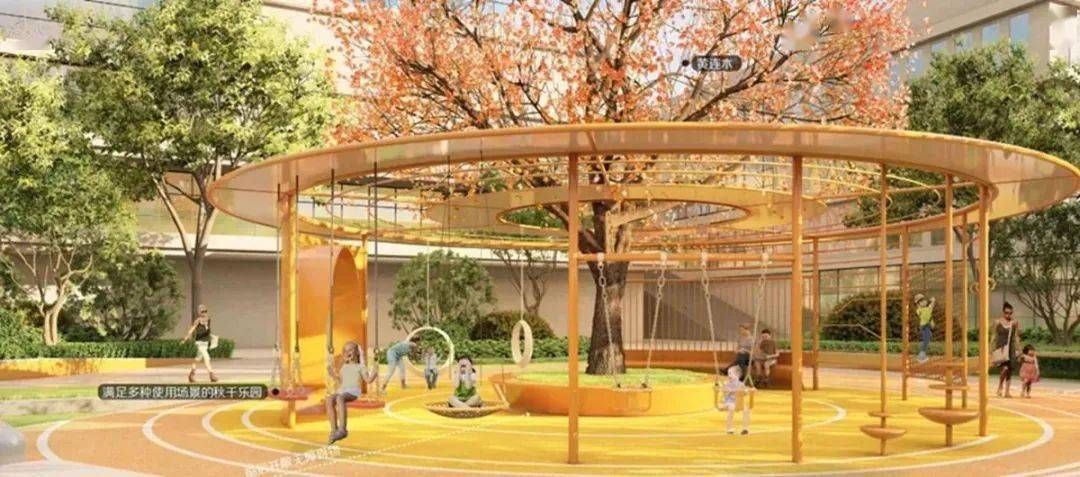 秋千乐园可以供各类人群追忆童年乐趣,同时,分区活动的设计可满足老人、儿童对休闲、社交、健身等多种功能的需求。